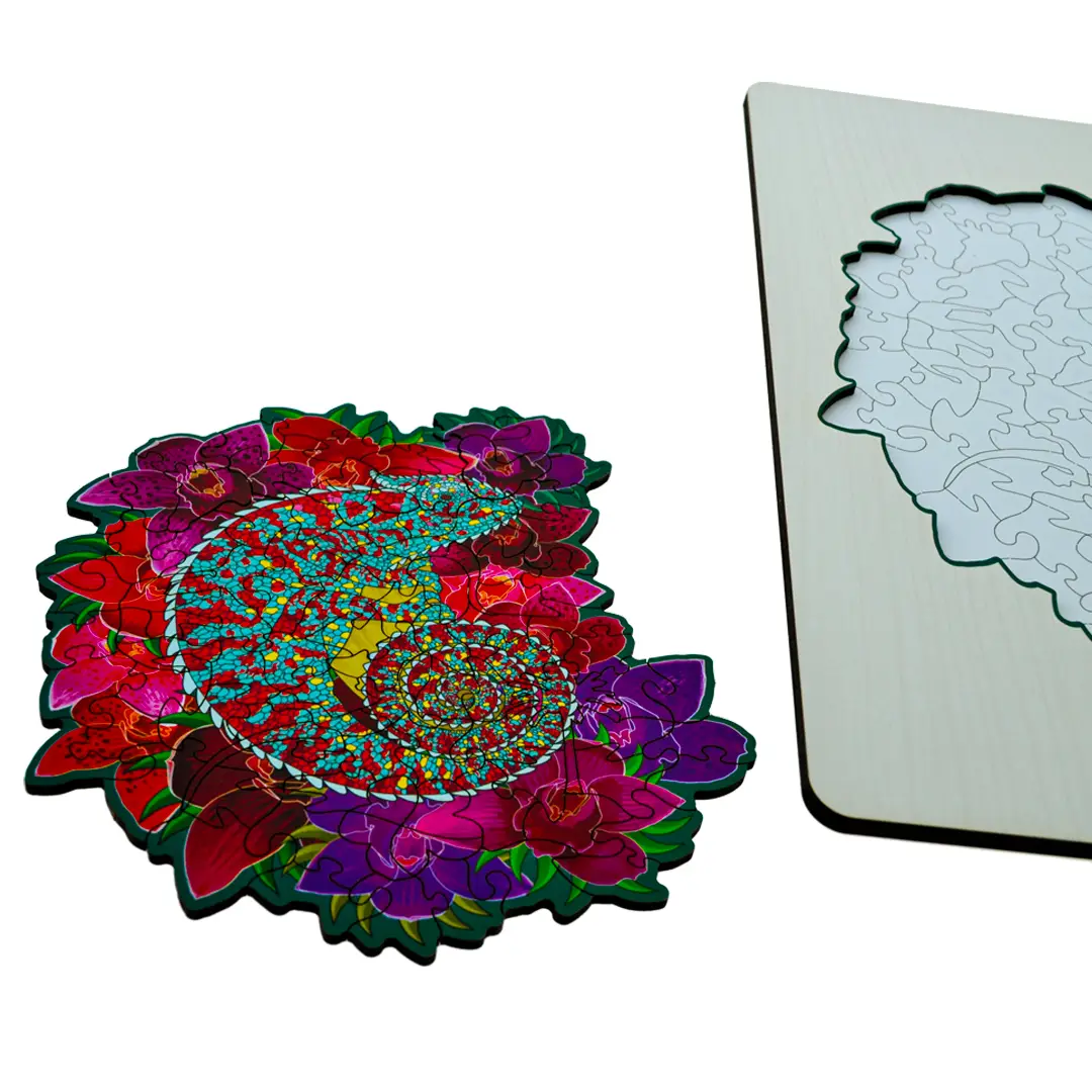 A vibrant wooden puzzle featuring a colourful chameleon in a sturdy frame. Designed for little hands, it helps build fine motor skills, coordination, and problem-solving through fun, hands-on play. Made from safe, durable materials â perfect for curious toddlers!