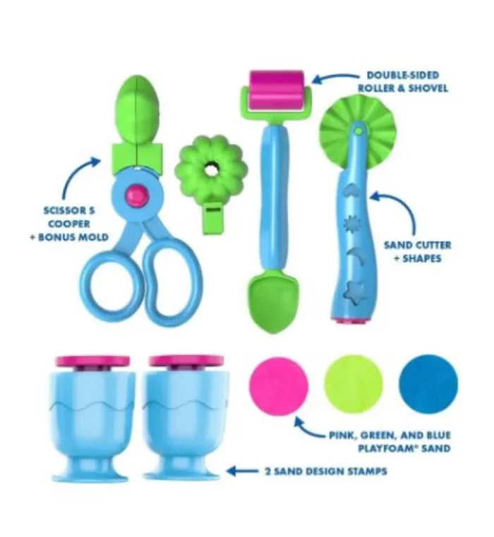 This set includes colorful, non-toxic Playfoam Sand that’s soft, squishy, and perfect for molding, shaping, and sculpting.