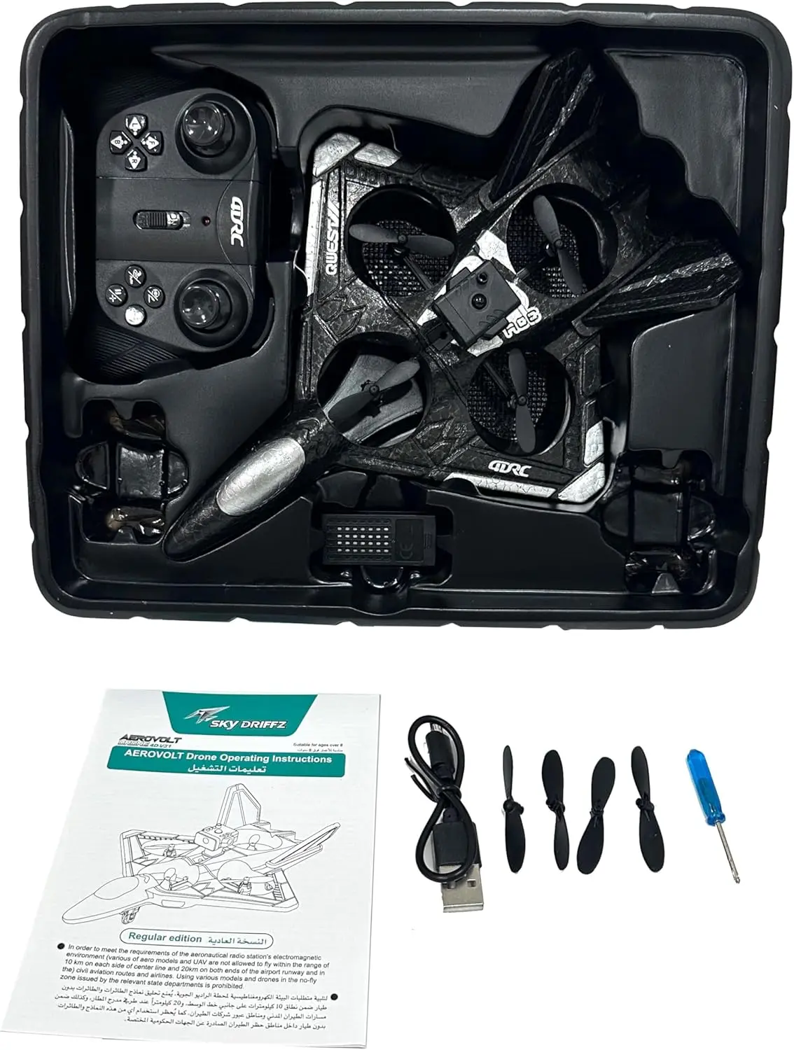 Introducing the Sky Driffz Aerovolt Drone 4D-V31, a 2.4G RC plane with advanced features. This drone comes with a normal remote controller equipped with obstacle avoidance and fixed altitude capabilities. It offers various functions such as forward, backward, ascend, descend, left and right turns, and high and low-speed modes. The drone also features headless mode, air pressure altitude holds function, one-key take-off and landing, left and right rolling, one-key calibration, emergency landing, and obstacle avoidance. Suitable for ages 8 and up