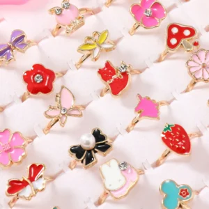 Each ring comes with a cute cartoon charm such as flowers, butterflies, hearts, cherries, bows, strawberries, and more.