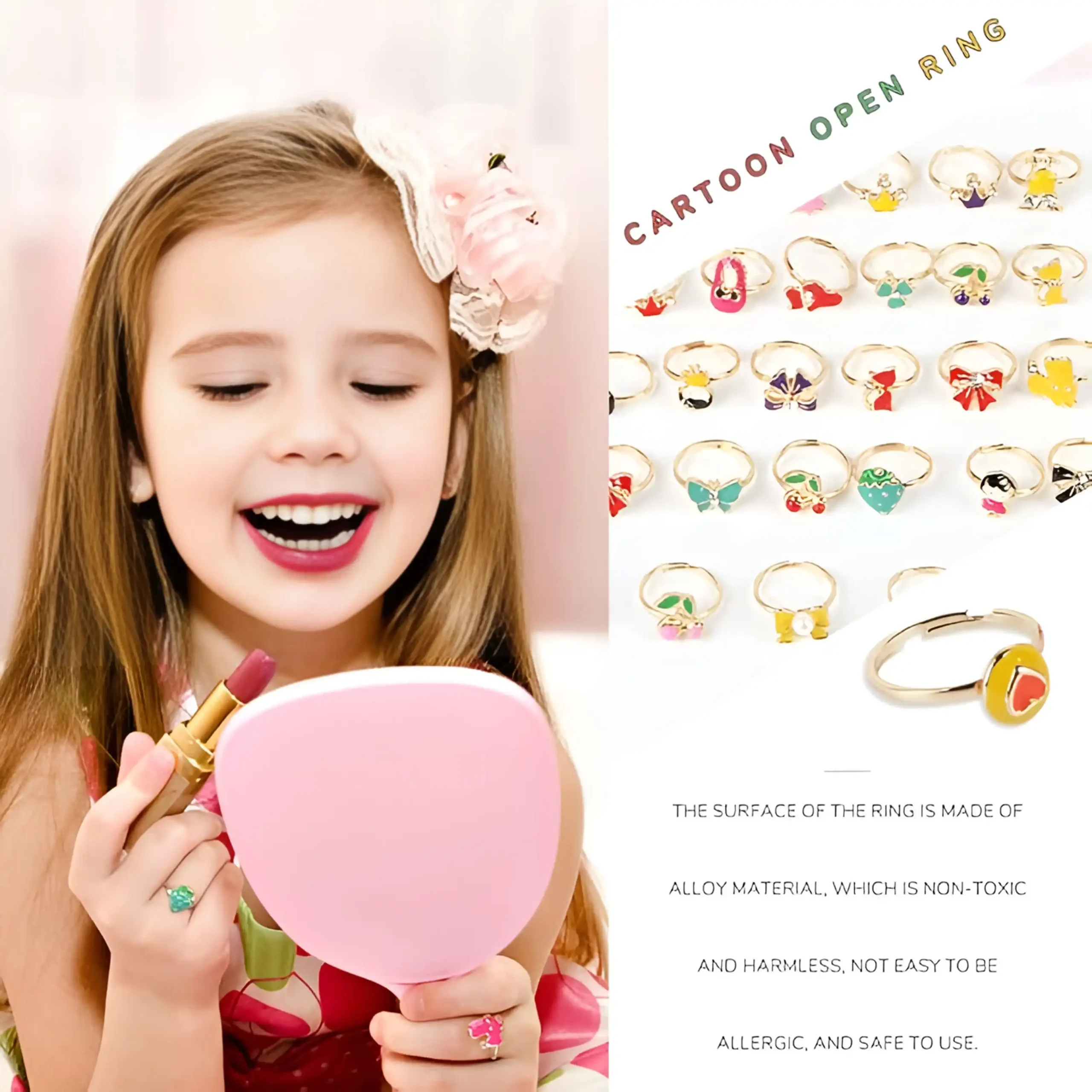 Each ring comes with a cute cartoon charm such as flowers, butterflies, hearts, cherries, bows, strawberries, and more.