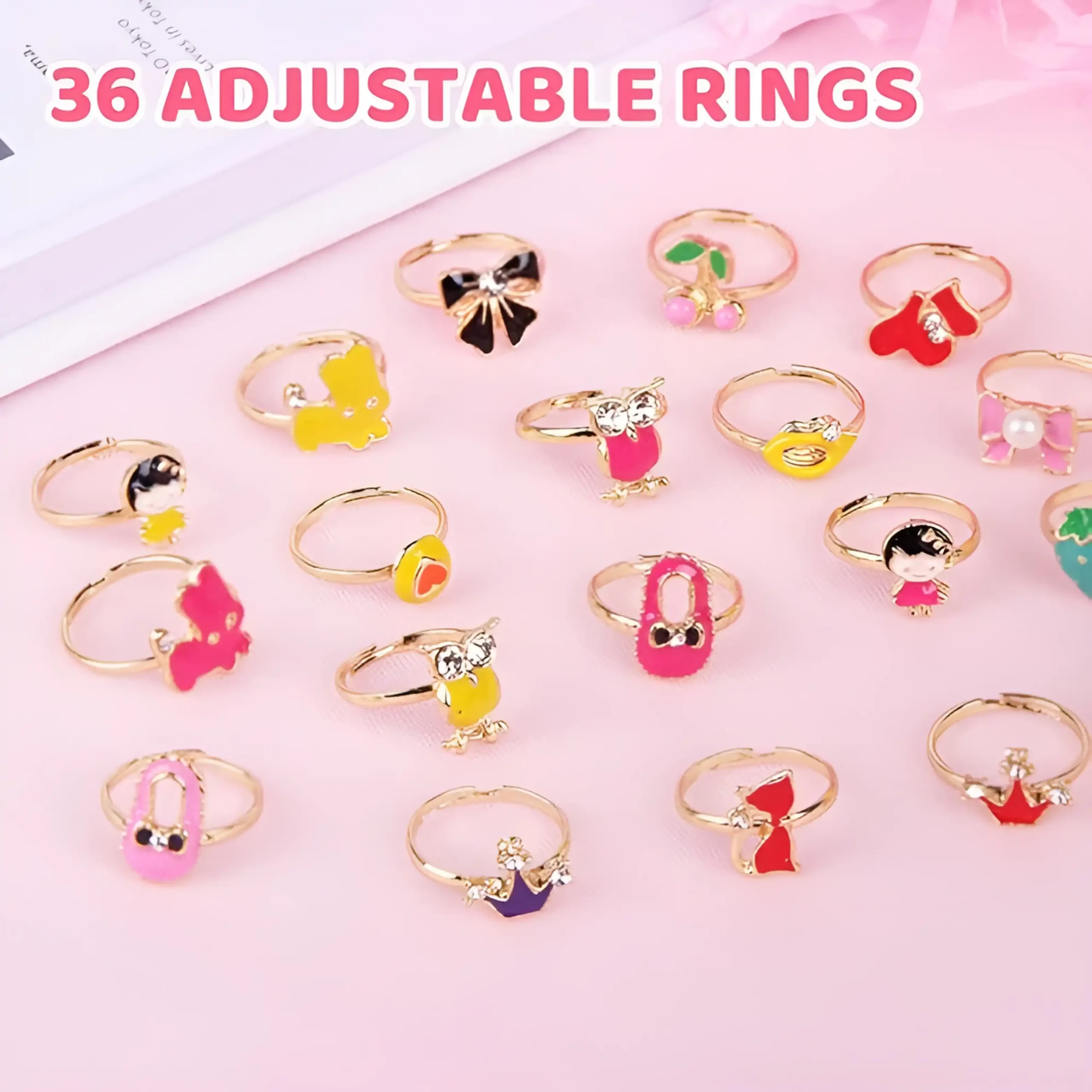 This adorable 36-Piece Adjustable Girls’ Ring Set is perfect for dress-up, pretend play, parties, and gifting!