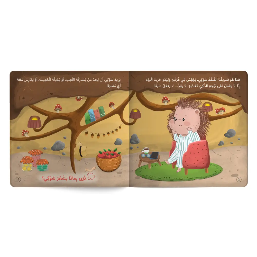 - Teaching the child to express and control their emotions through meaningful dialogues between the story’s characters; Shawki the hedgehog, and his friends: the spotted dog, the squirrel, the singing bird, and the mischievous rabbit.