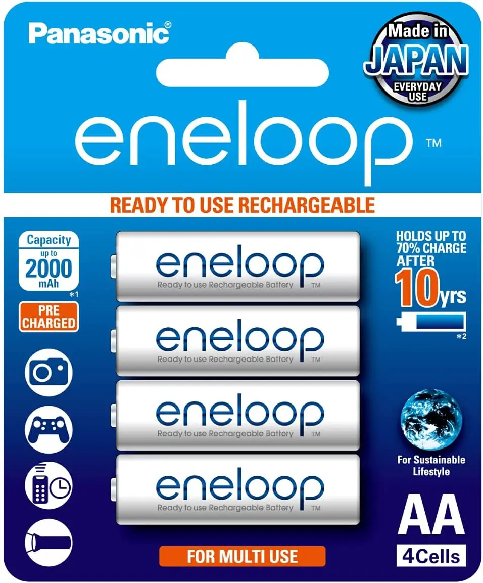 The Panasonic Eneloop BK-3MCCE/4BT is a set of four pre-charged, low self-discharge Ni-MH AA rechargeable batteries. These batteries combine reliability, environmental friendliness, and long-term performance in a compact package.