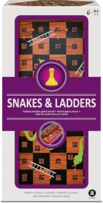 Watch out for those slippery snakes 4 coloured playing pieces 1 dice folding wood board with magnetic closure board opens to large 11.6” x 11.6” 29.5 cm x 29.5 cm size. Whats in the box 4 coloured playing pieces, 1 dice, 1 wooden folding board with magnetic closure, instructions.