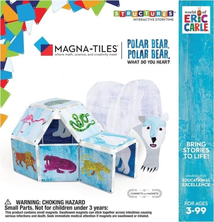 Meet colorful animals like a fluting flamingo and a trumpeting elephant along with other animals that decorate the pages of the book with this MAGNA-TILES® Structures set based on the Eric Carle book, Polar Bear, Polar Bear What Do You Hear?