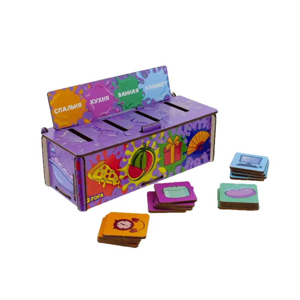 This colourful wooden sorter features a sturdy box with illustrated scenes from different rooms in the house, including the bathroom, bedroom, kitchen, and more. The set includes two interchangeable boards – one showing household rooms, the other displaying basic shapes – along with matching object pieces. Children are challenged to match each item to its corresponding room or shape, encouraging learning through hands-on discovery