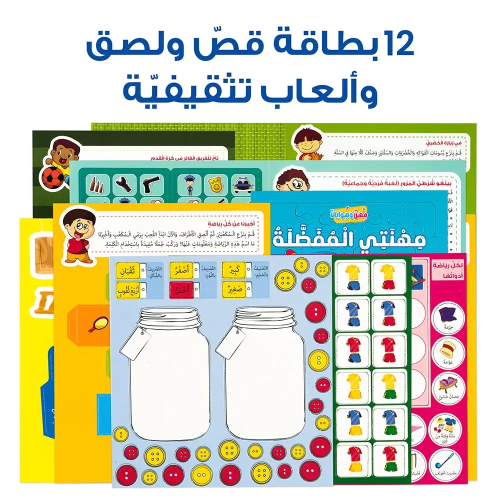 11 game cards: Bingo game / sorting game / Tailor and buttons / Sports equipment / Jigsaw puzzle / Memo cards / Football & basketball crowns / Sports’ cube / 3D Basket, sorting game / Carpenter tools.