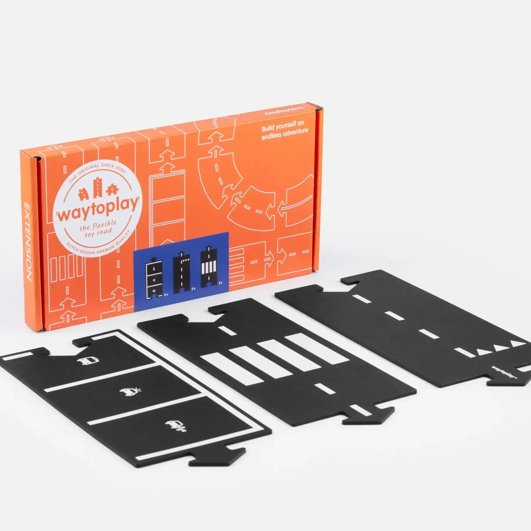 The waytoplay road parts are printed on both sides. Put them between or beside your waytoplay roads for even more fun. You expand your waytoplay motorway with six road straight parts.