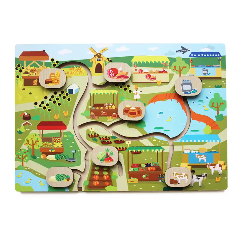 Introduce your child to the exciting world of the Maze Puzzle “Market,” an educational toy that combines fun with learning. This engaging game features a vibrant market scene with various stalls like meat, dairy, and vegetables. Your little one helps different food pieces find their correct sections by navigating them through the maze, developing logical thinking and fine motor skills along the way. Bright illustrations expand your child’s knowledge about foods while encouraging attention and patience. Made with smooth, child-friendly pieces, the Maze Puzzle “Market” is a safe, colorful, and captivating toy that makes a perfect gift for any occasion. Click “Buy” now and let your child embark on a delightful market adventure!