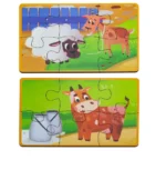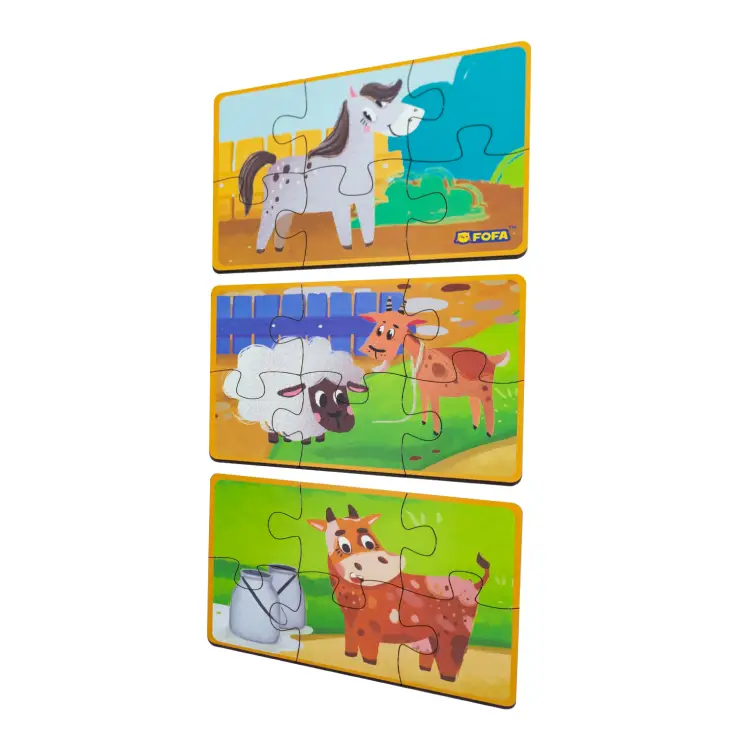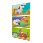 he Puzzle Set “Cow, Horse, Sheep” is a colorful and fun introduction to farm animals that’s perfect for toddlers. Featuring three adorable animal puzzles with six large pieces each, this set helps develop fine motor skills, logical thinking, and creativity as kids explore the animal world. Made from safe, high-quality materials, the pieces are perfectly sized for little hands and great for both at-home play and travel. The bright illustrations and cute characters inspire imaginative storytelling, making this compact set a wonderful gift that combines entertainment and learning. Click “Buy” now and let your child enjoy a fun and educational journey to the farm!
