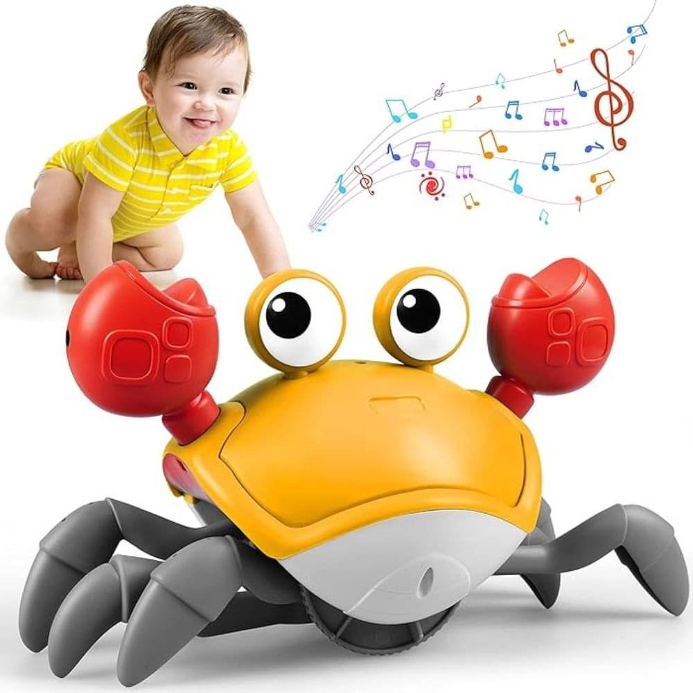 Crawling Crab Baby Toy, A Cute Walking Crab keeps Moving around, encourages Baby to Crawl and Catch. Tummy time toys, A Colorful Dancing Creature with Big eyes, Draws Tummy time Infants’ Attention even when Little ones cannot Craw yet. It makes their eyes Follow, Full of wonder. High Quality ABS Plastic, Non-Toxic and Safe. Specification Colors and Contents May Vary From illustration. Good Choice For Kids Birthday/Christmas Gifts. (Rechargeable DC 5V USB Charging Cable). Made in China.