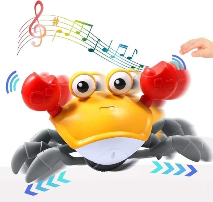 Crawling Crab Baby Toy, A Cute Walking Crab keeps Moving around, encourages Baby to Crawl and Catch. Tummy time toys, A Colorful Dancing Creature with Big eyes, Draws Tummy time Infants’ Attention even when Little ones cannot Craw yet. It makes their eyes Follow, Full of wonder. High Quality ABS Plastic, Non-Toxic and Safe. Specification Colors and Contents May Vary From illustration. Good Choice For Kids Birthday/Christmas Gifts. (Rechargeable DC 5V USB Charging Cable). Made in China.